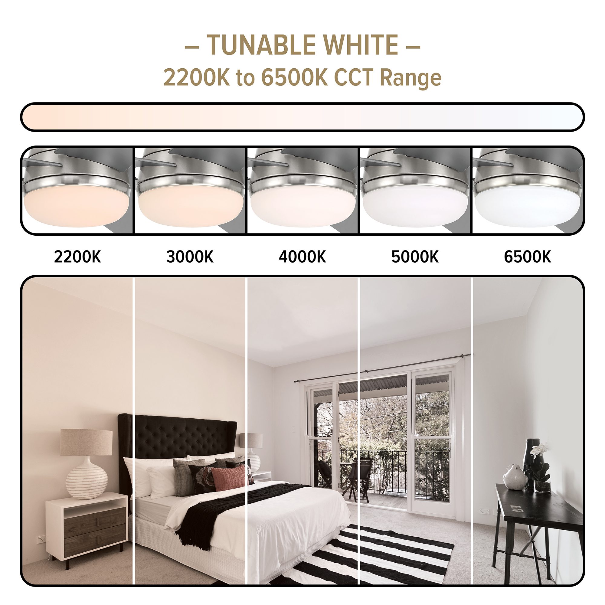 • Set the tunable white temperature anywhere between the warm glow of 2200K to the cool daylight of 6500K