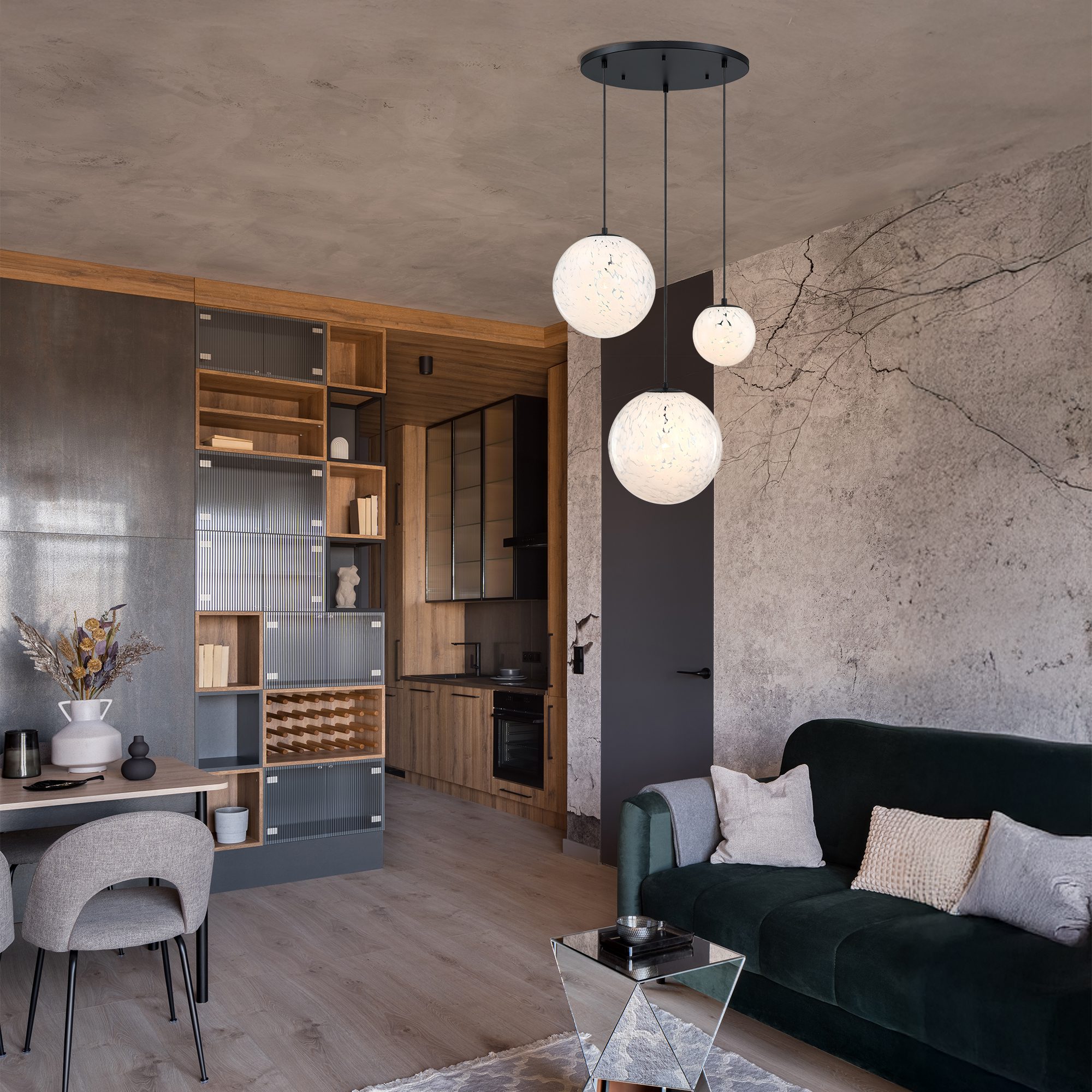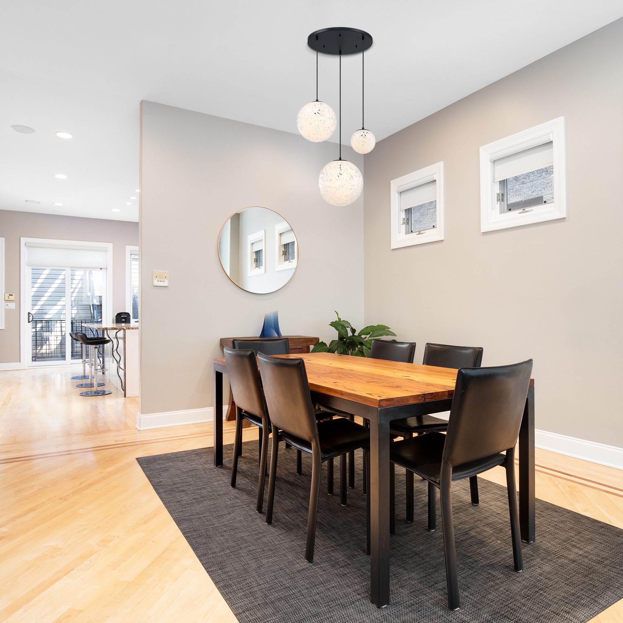 • Modern ceiling-mounted light features (1) 7 in., 12 in., and 14 in. white art glass shades