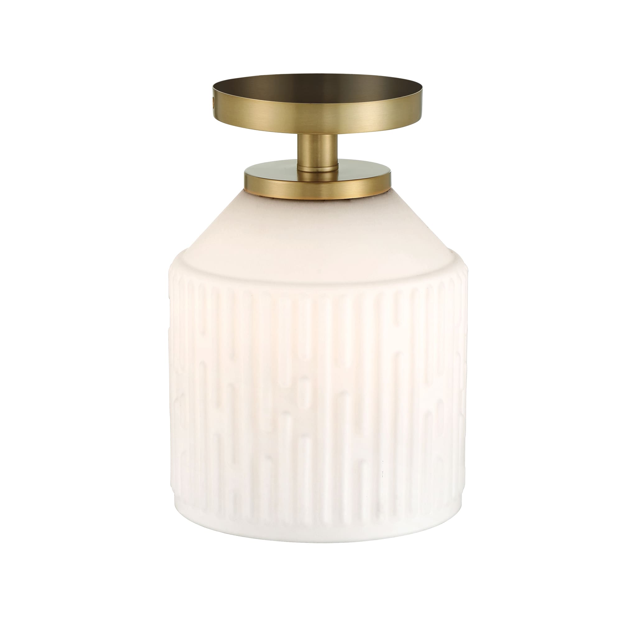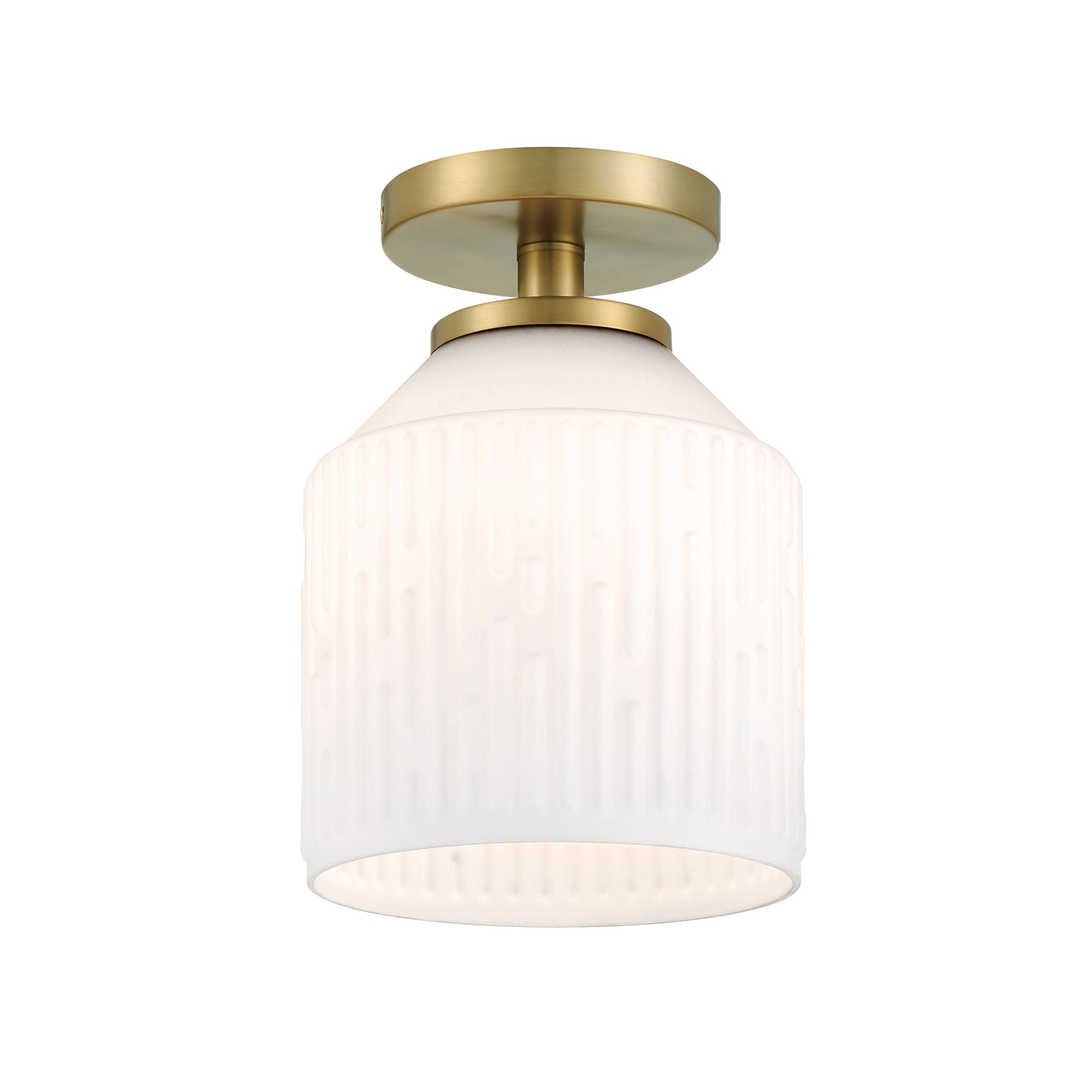 • Modern semi-flush in Brushed Gold with an Etched Opal Glass shade