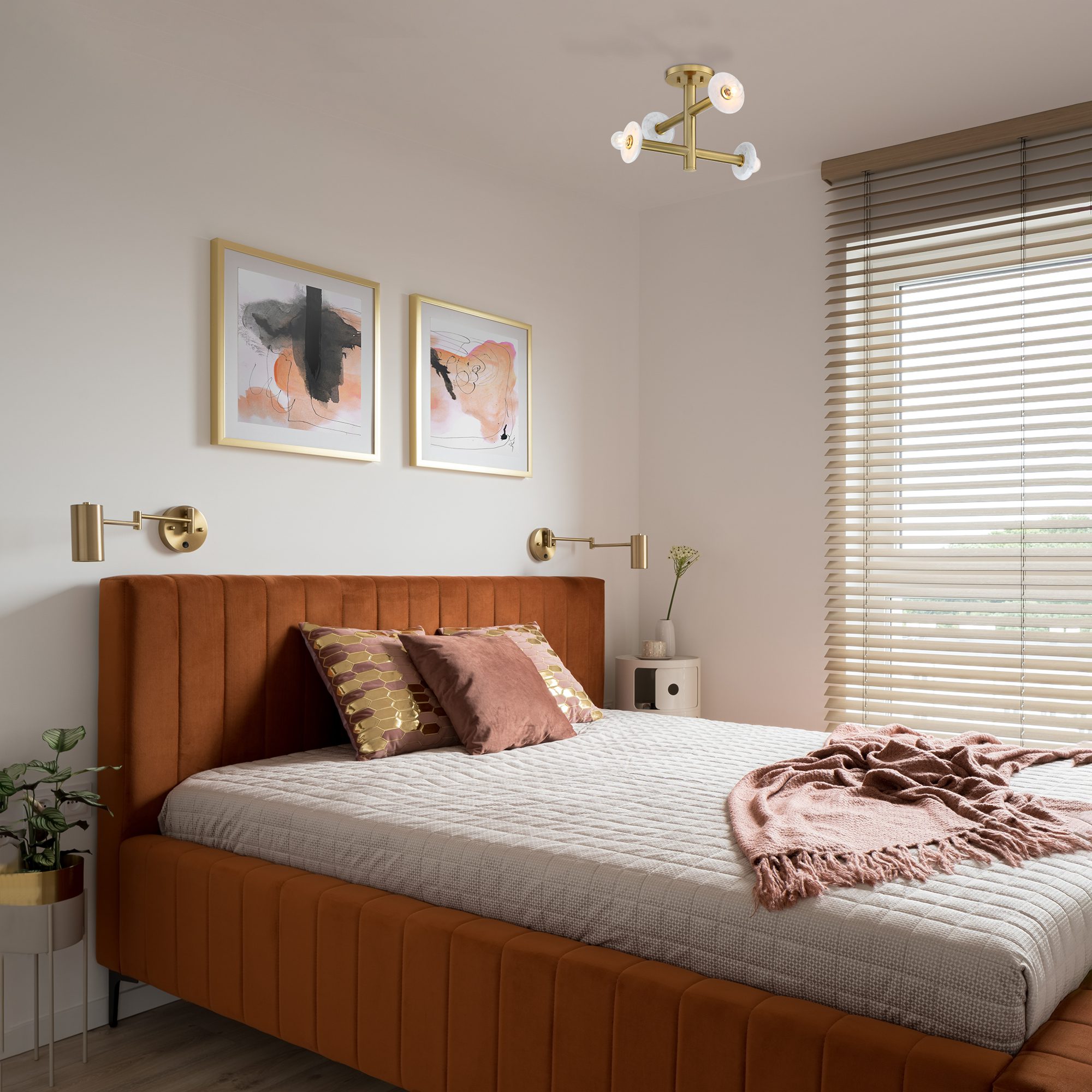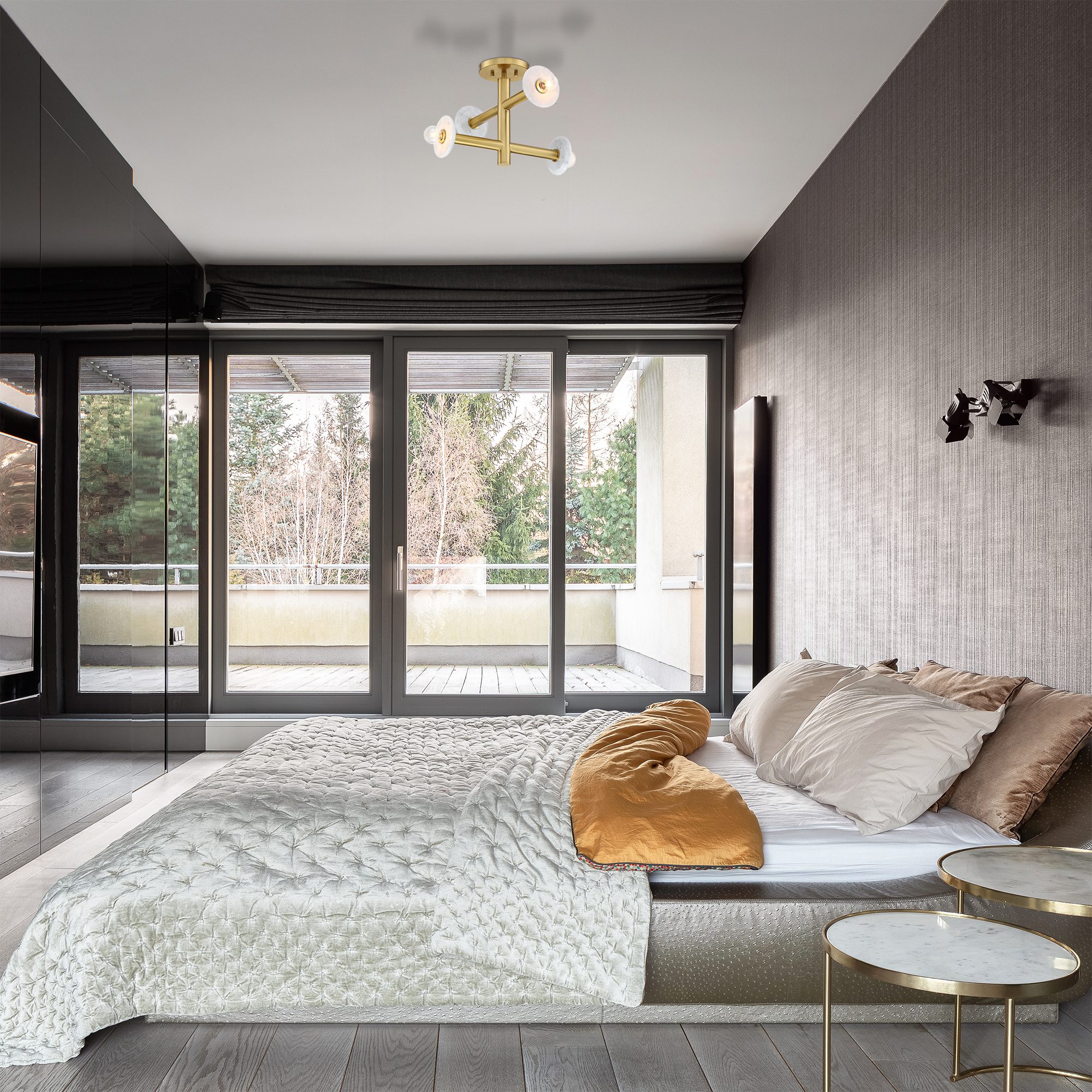 • Modern and minimalist brushed gold ceiling-mount semi-flush light