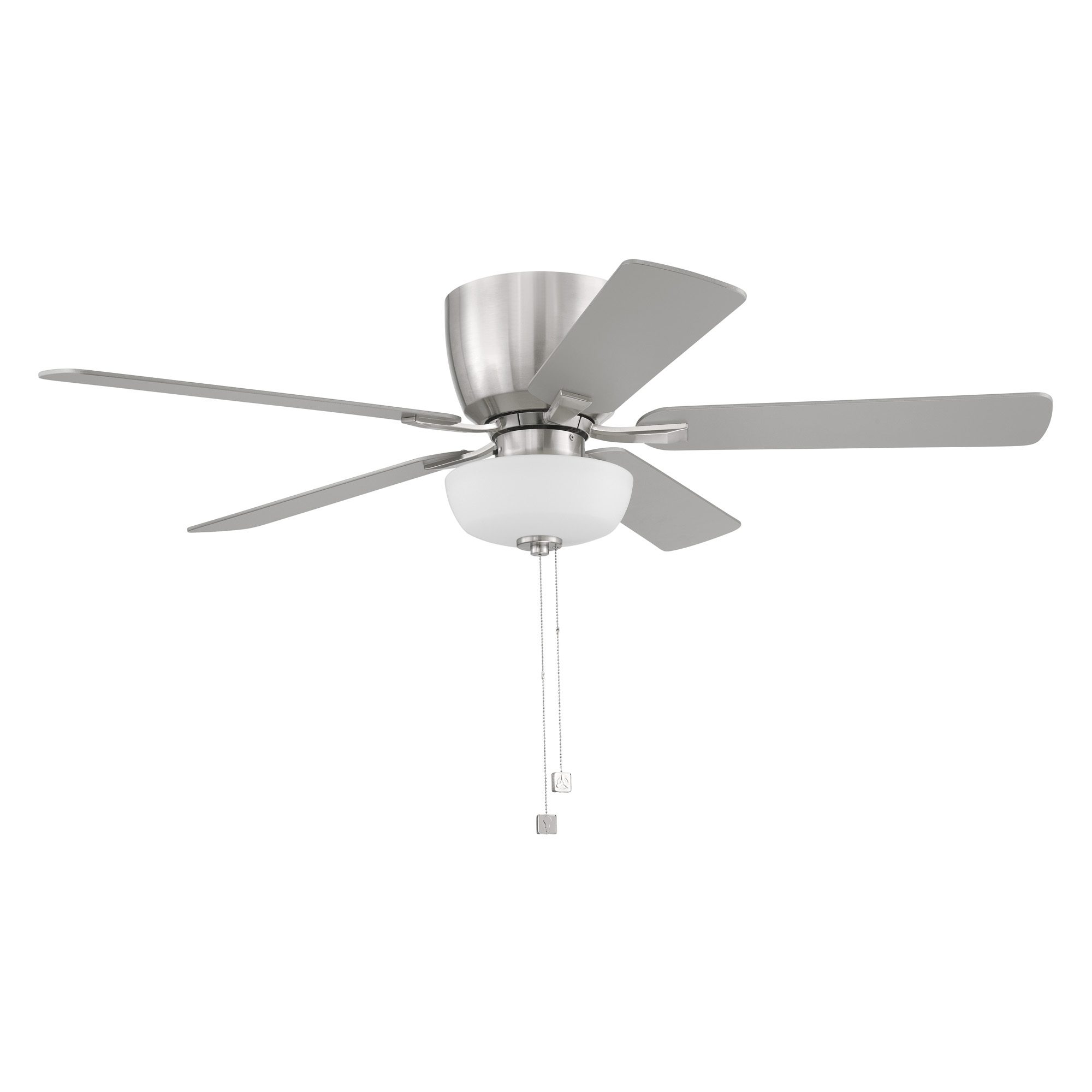 • Transitional brushed nickel fan for indoor or covered outdoor use