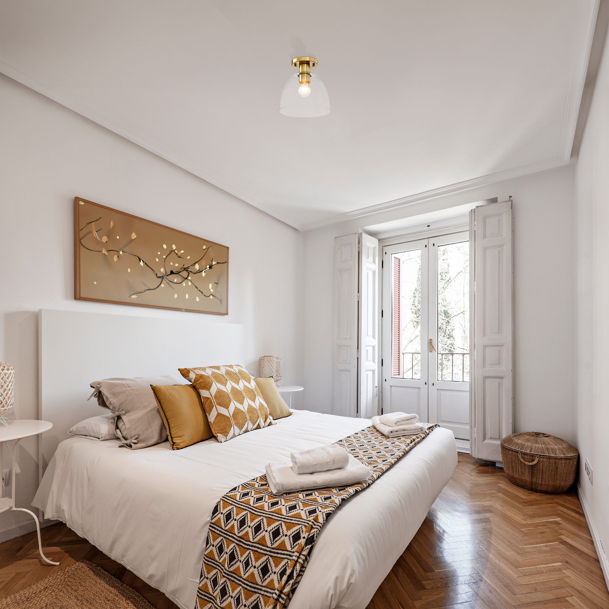 • Mid-century modern brushed gold ceiling-mount semi-flush light